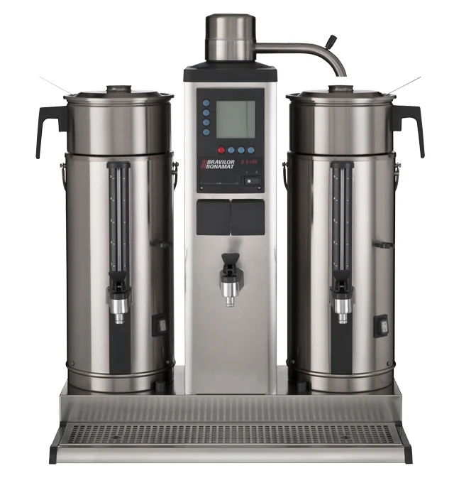 Bravilor B5 HW er en kraftig filterkaffemaskin med én traktesøyle, to 5 L beholdere og egen tappekran for varmt vann – perfekt for servering av store mengder kaffe i bedrifts- og kantinemiljøer.